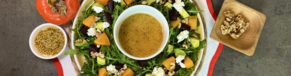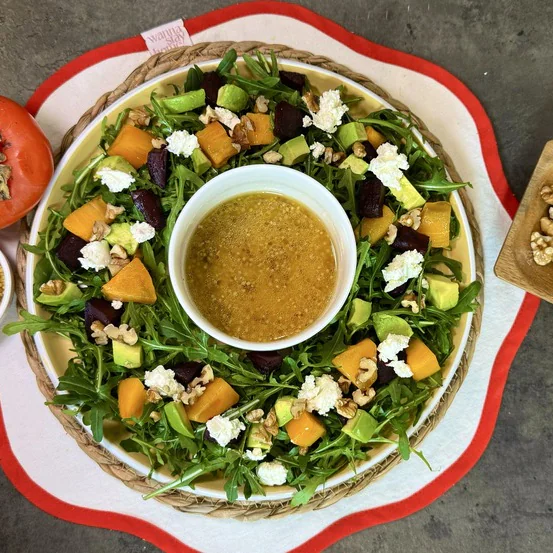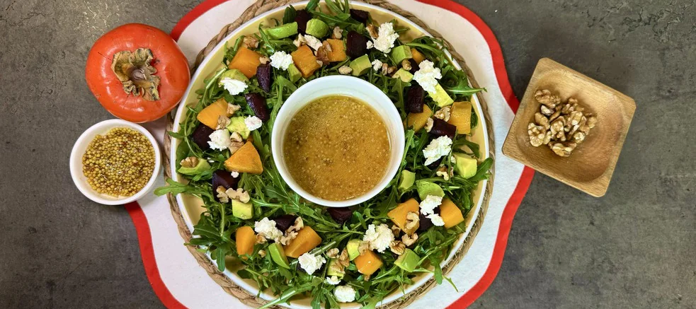 На тарелку выложите рукколу, оставив в центре место для соуса. Сверху добавьте хурму, свеклу, авокадо и творожный сыр. Посыпьте грецким орехом. Приятного аппетита.