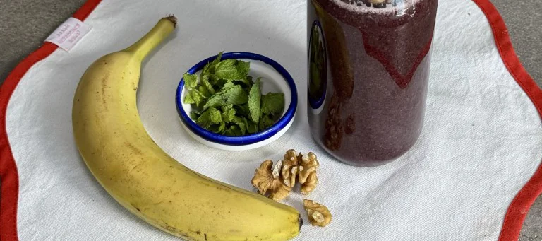 В чашу блендера добавить кусочки банана, замороженную чернику, колотый грецкий орех, пару листов мяты и шпинат.