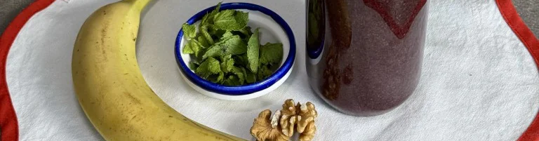 Вылить готовый смузи в стакан, украсить мятой и колотым грецким орехом. Приятного аппетита!